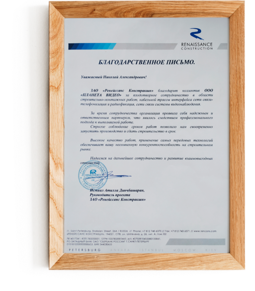 Строительно-монтажные работы по установке автоматической системы пожарной сигнализации, охранной сигнализации, установка и наладка систем видеонаблюдения в компании ЗАО “Ренейссанс Констракшн”